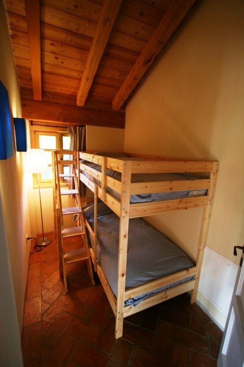 Top floor. Bedroom 3 is a large double room with French windows the whole width of the house, giving spectacular views of the mountains. It also has a wardrobe and chest of drawers. Bedroom 4 is a small room with a bunk bed. The spacious bathroom opposite has a large open shower.