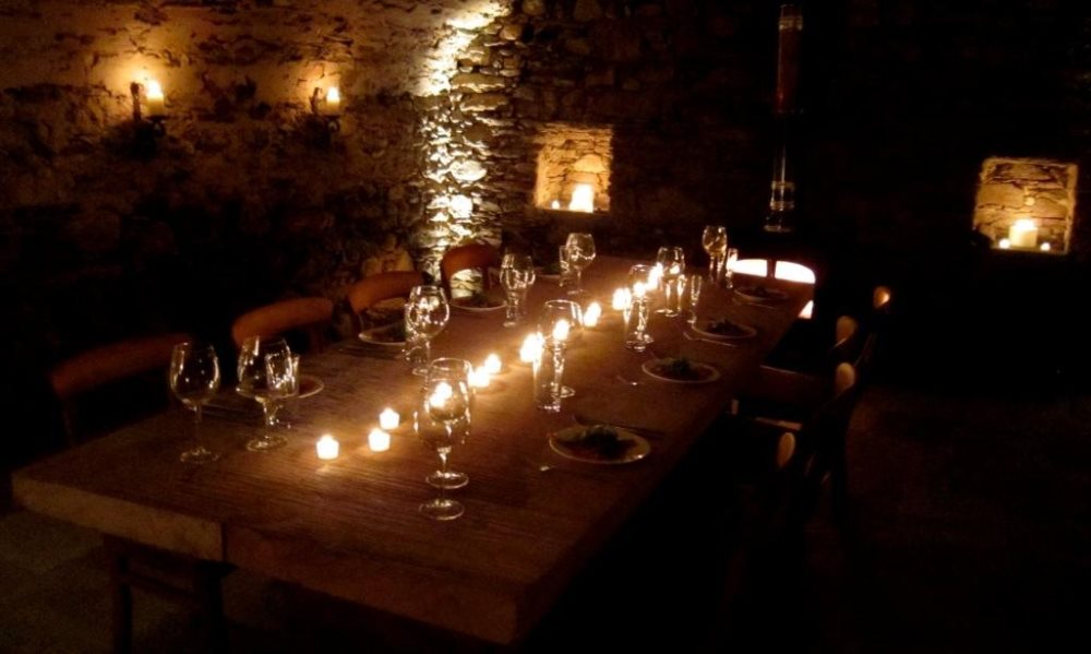 Cellar. The original vaulted cellar can be accessed from the stairwell or garden and is lit with an atmospheric combination of floor lighting and candles. Heated by a large wood burning fire, with a handmade rustic 10 seater oak table this is a unique and very special place to enjoy cool dining in the heat of the summer and cosy warmth in the depths of winter.