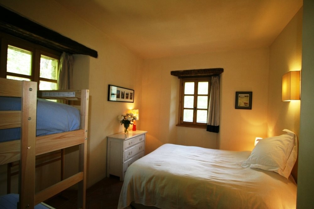 Garden. The peaceful garden is terraced, with surrounding stone walls and extends into the woods and all around the house. There is a paved area outside the house with seating and a grass lawn on two levels. The lower level has a beautiful antique stone table, which easily seats 8 people. There is a traditional stone BBQ and a children’s climbing frame with swing, slide and playhouse. The lake is just 5 minutes walk away and is accessed via a path on private land. The path is rather steep and difficult in some places so do take care.